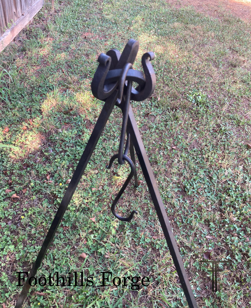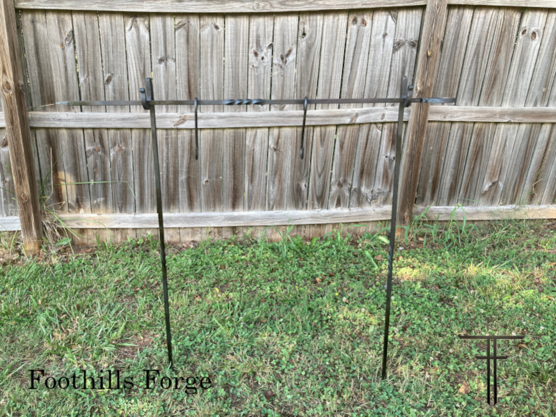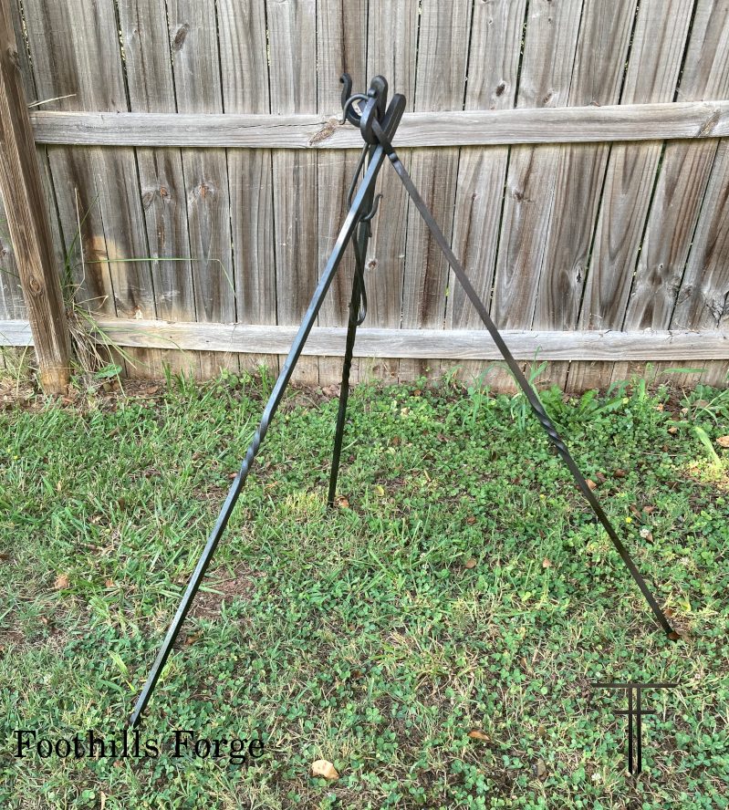This 5 piece set can be used in a tripod configuration as shown above or two of the legs can be driven into the ground and the third placed as a hanging bar. The legs are made using 1/2 inch thick mild steel square bar. With both configurations the highest point is approximately 40 inches above the ground. The set includes three approximately 45 inch legs and two approximately 7 inch “s” hooks. Each set is hand crafted so slight variations in length should be expected.